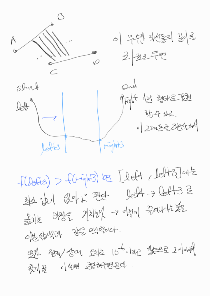 민호와 강호가 가장 가까웠을 때의 거리를 출력한다. 절대/상대 오차는 10-6까지 허용한다.